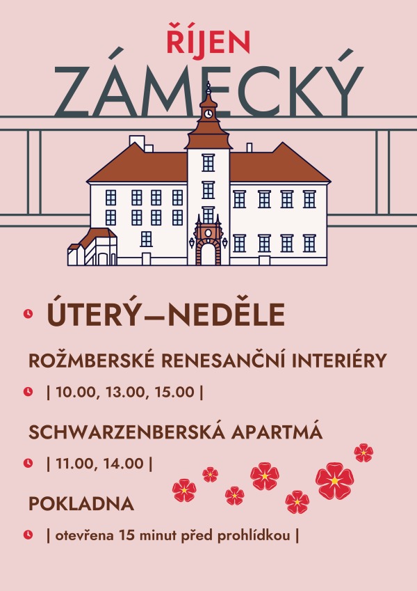 ZÁMEK V ŘÍJNU |ÚT–NE|: TRASA A |10.00, 13.00, 15.00|, TRASA B |11.00, 14.00|, POHÁDKOVÝ SVĚT LOUTEK |11.00, 15.00|, POKLADNA otevřena 15 minut před prohlídkou